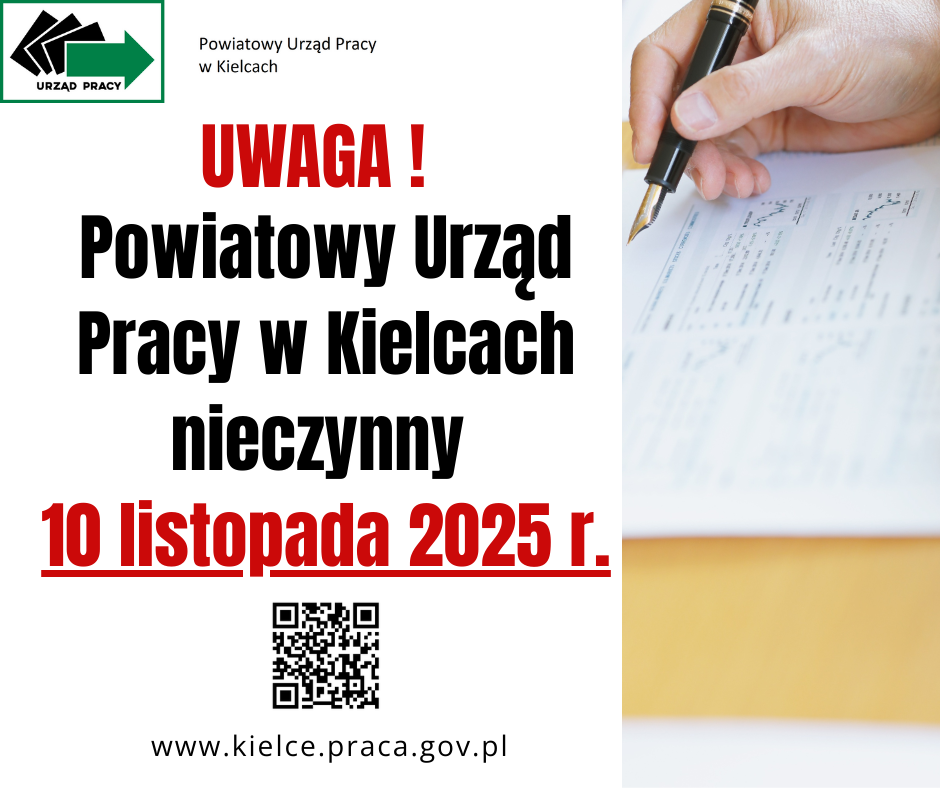 Informujemy, że Powiatowy Urząd Pracy w Kielcach będzie nieczynny w dniu 10 listopada 2025 r. (poniedziałek).